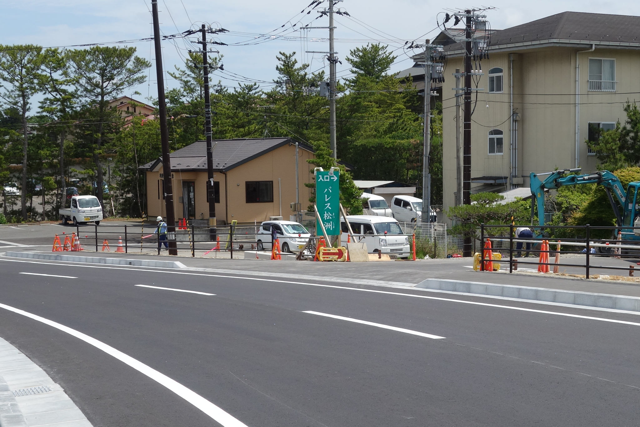 パレス松洲への入り口には現在、緑色の仮看板が立っています。橋の上から見ると入り口は看板の手前になりますので、お越しの際はご注意を。