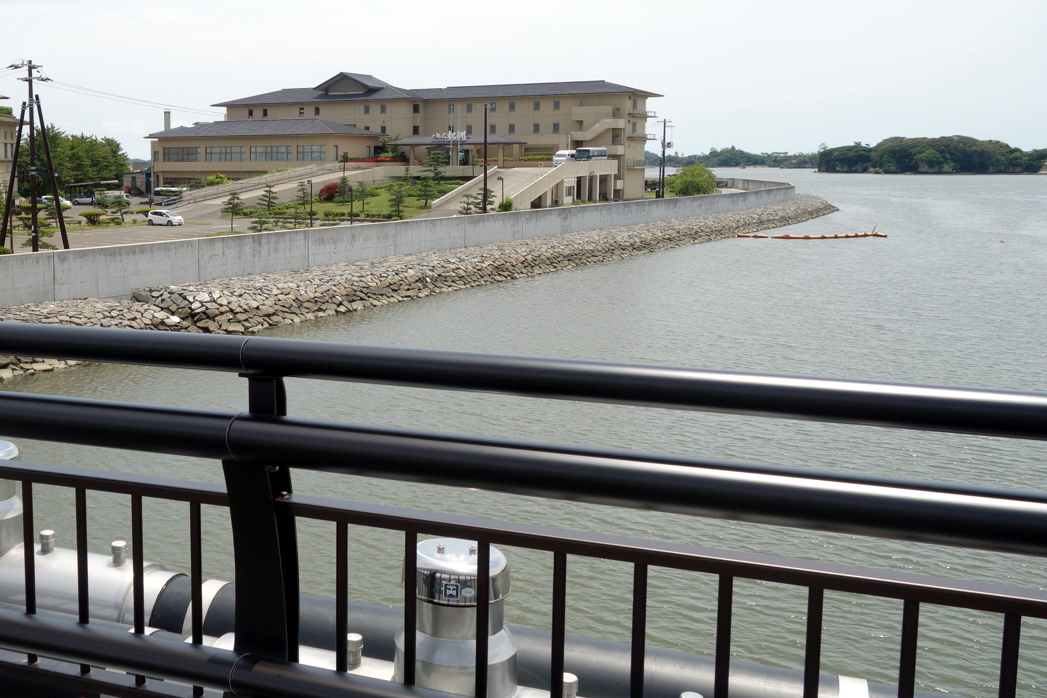 写真は国道45号線側から見た新しい松島大橋です。この写真だと向かって左側、高城川の対岸に、パレス松洲の建物が写っています。