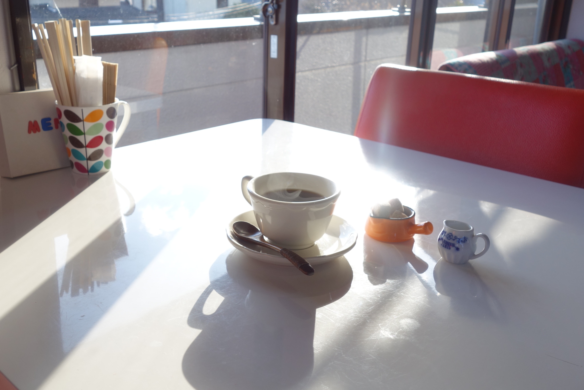 窓から差し込む午後の陽光が、テーブルの上でカップを浮かび上がらせています。