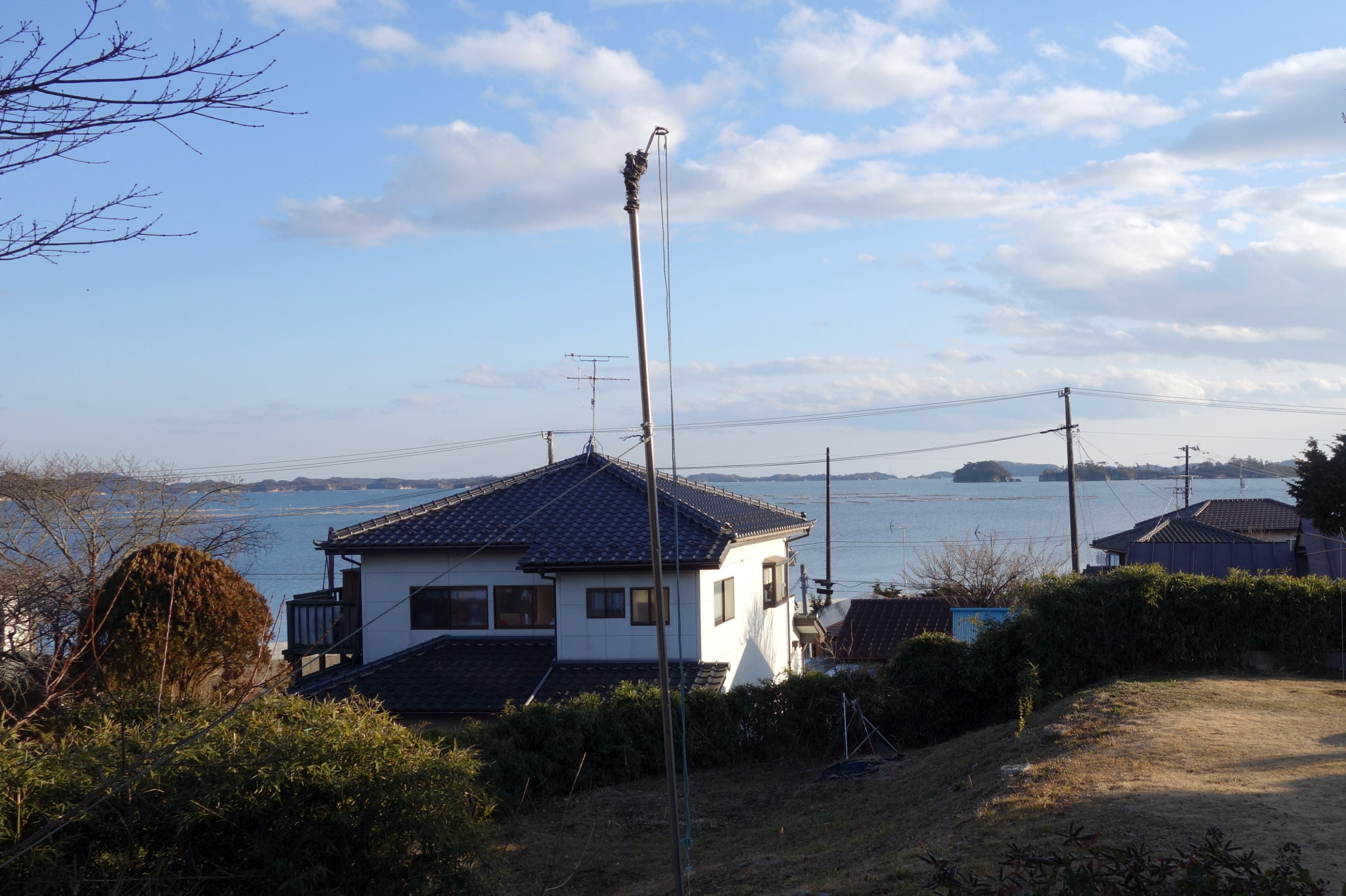 縄文人の住居は、公園を囲む高台にあったとのこと。高台に登ると、縄文人と同じ視界で松島の海を見ることができます。