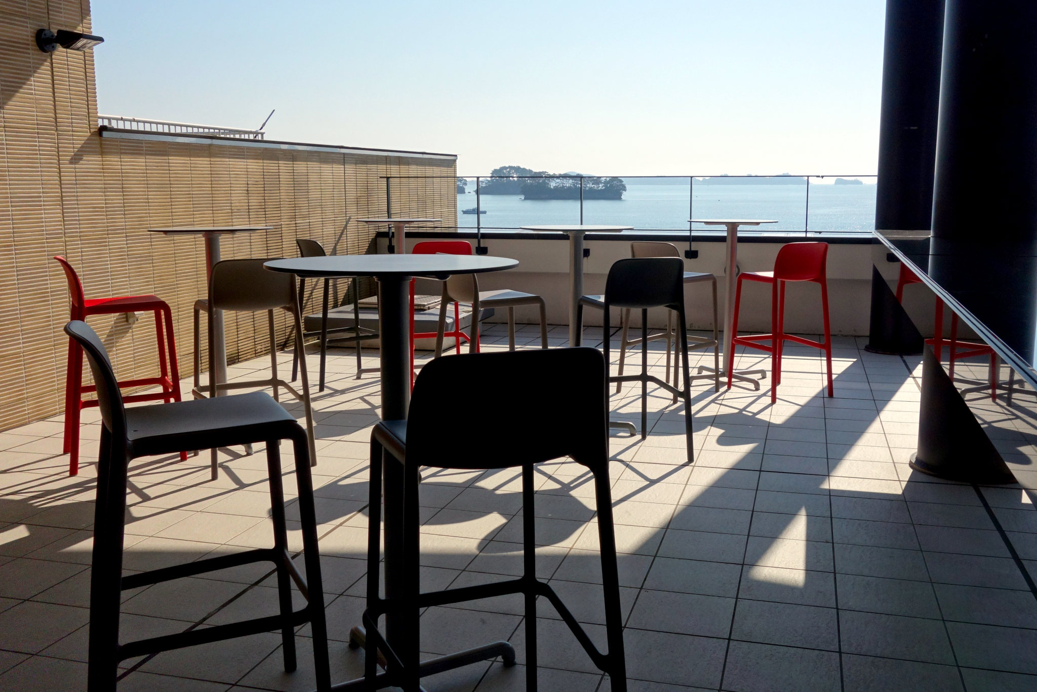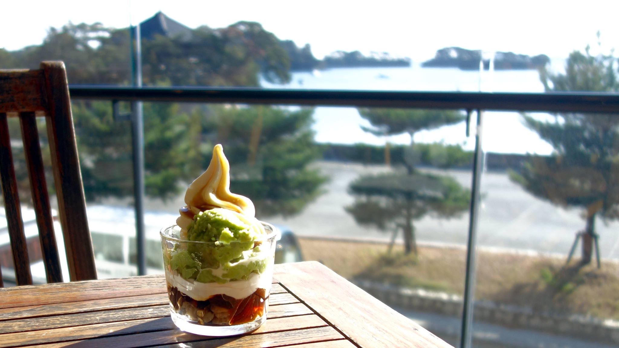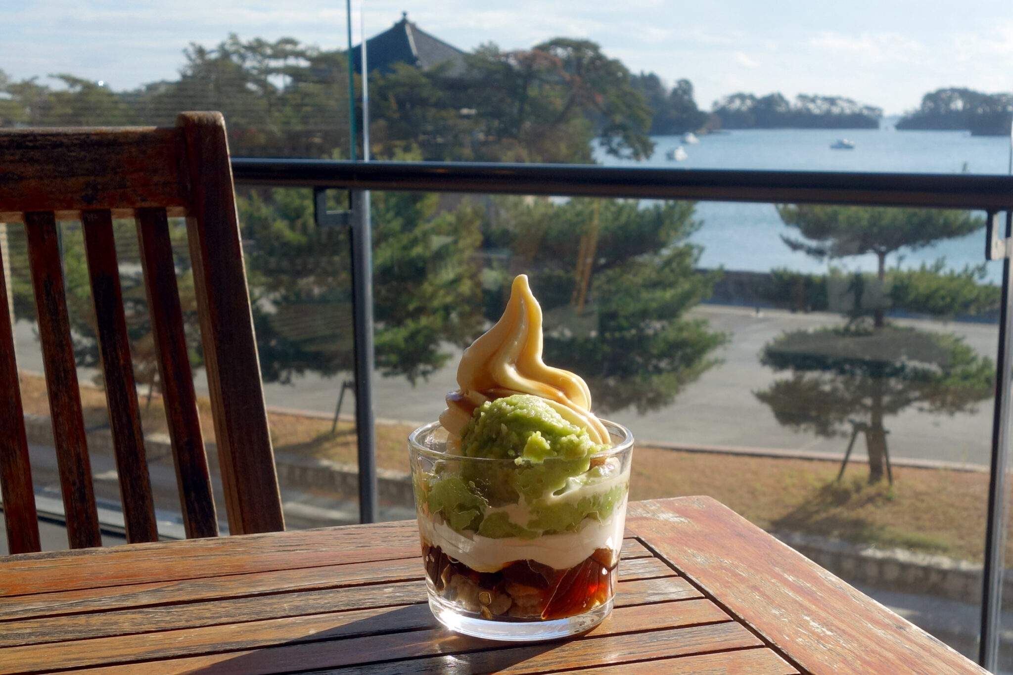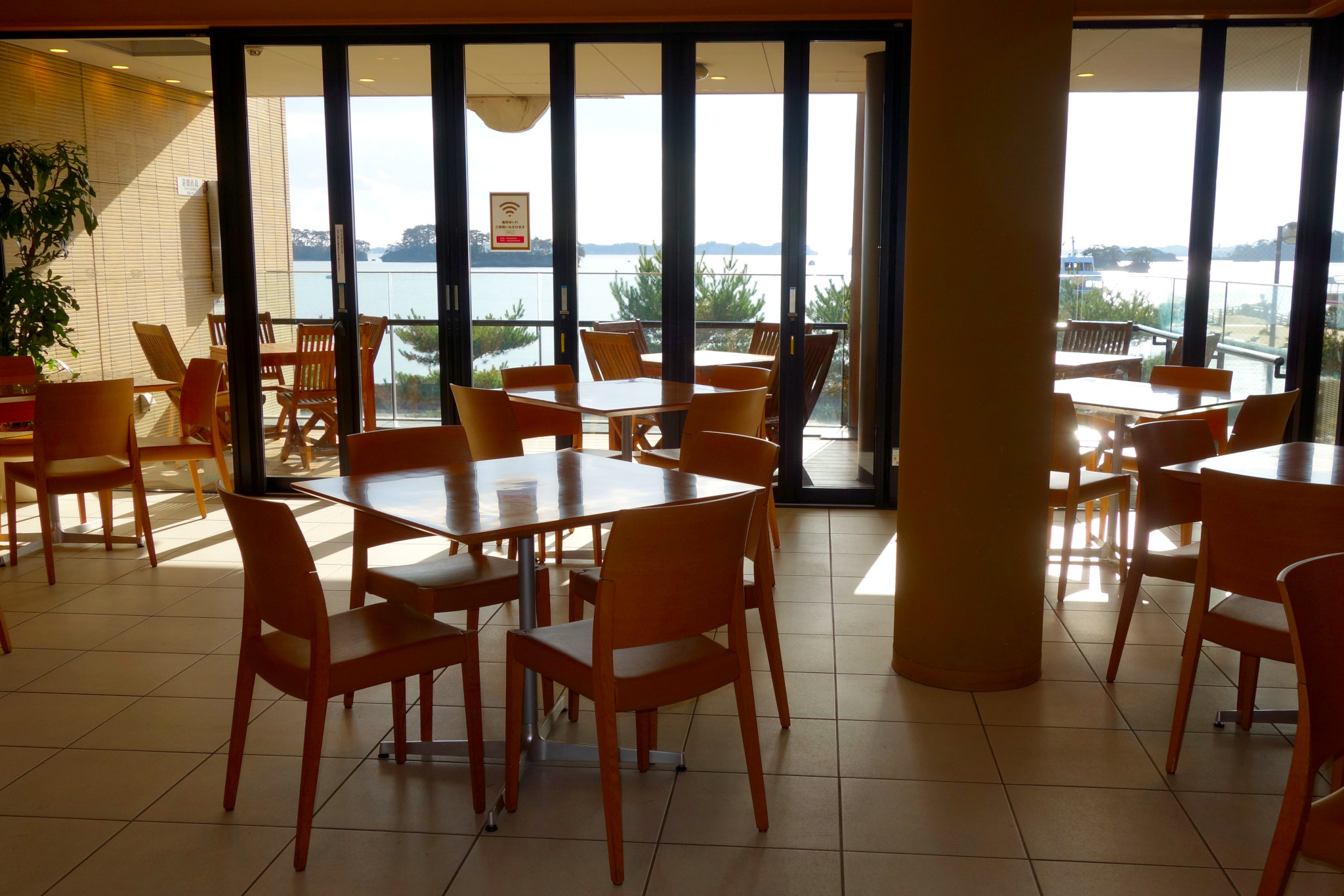 入店するとまず注文を受け付けるカウンターがあって、その先にフロアが広がっています。自然光が流れ込む暖かいトーンの空間は海向きに開けていて、窓いっぱいの松島の絶景を見ることができます。